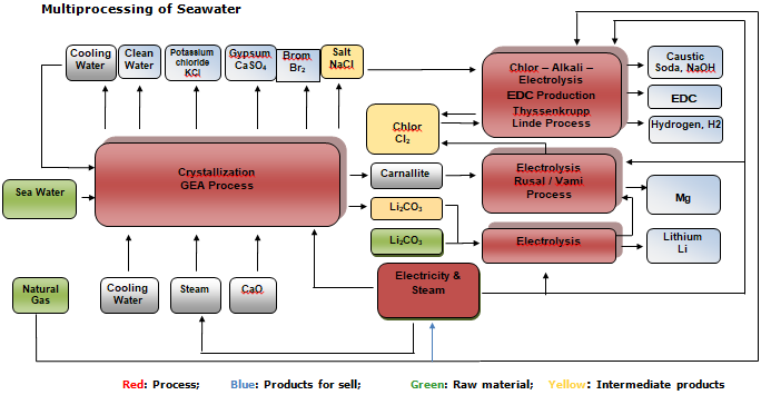 - Evaporation process by GEA, a German expert for crystallization and evaporation. A preliminary upgrade of the magnesium and Lithium concentration in seawater for the production of carnallite (basic material for the magnesium production process) and Lithiumcarbonate (basic material for the Lithium production process) is necessary.